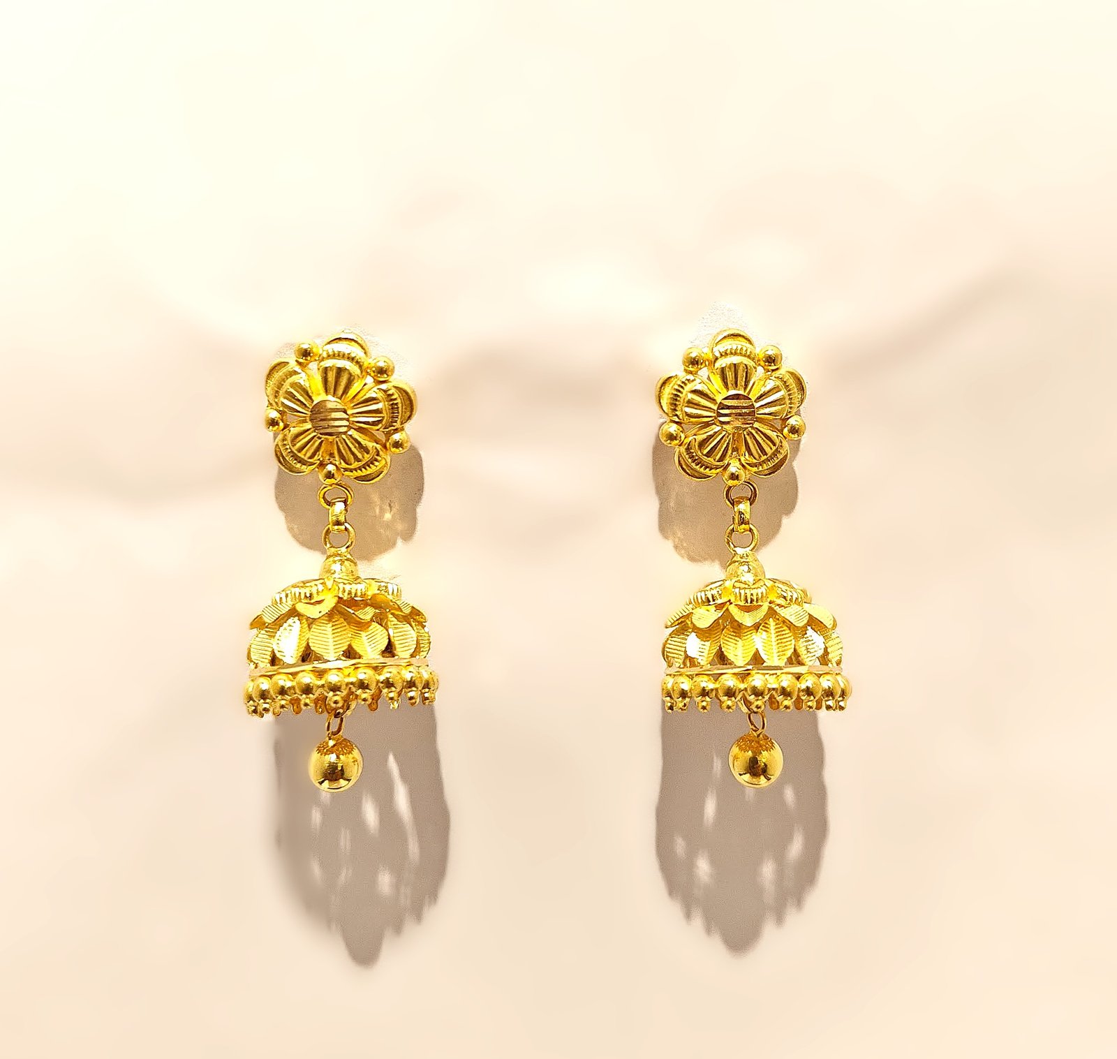 Artistically crafted in pure 22 KT gold, the Chitra Gold Jhumkhi celebrates traditional craftsmanship and intricate detailing. Designed with a graceful bell-shaped form and fine gold accents, it reflects elegance, heritage, and timeless charm—perfect for festive occasions and classic ethnic looks.